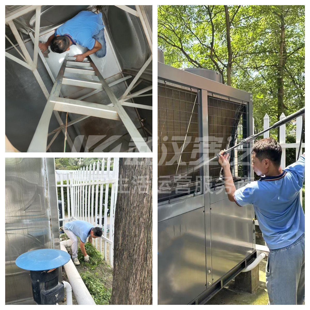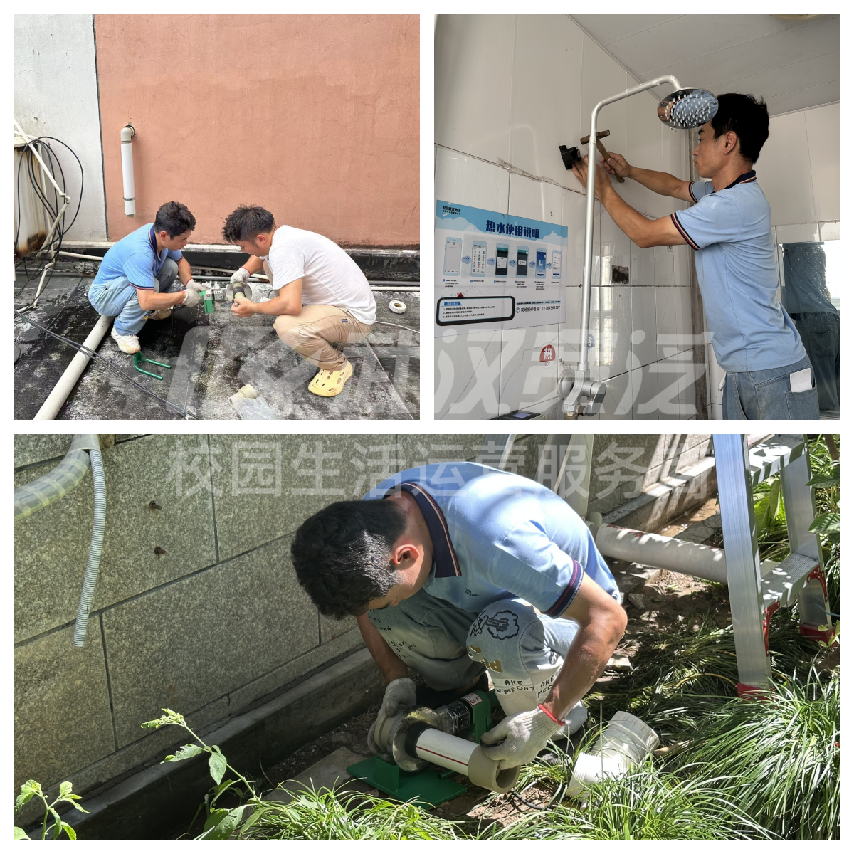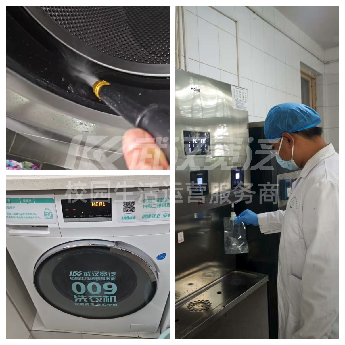 洁净的校园环境是保证校园生活品质的基础。武汉宽泛提前筹划,自暑期收尾时起便着手设备及周边环境的清洁消毒工作。在暑期使用低峰期,驻校运维人员开展了清洗保温水箱,清除内部沉积杂质,深度清洁洗烘设备并进行高温消毒等一系列工作。